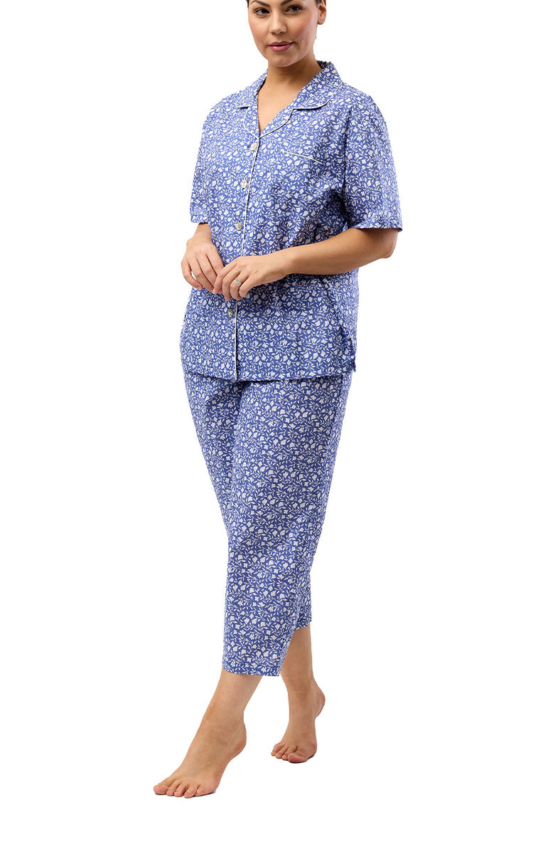 This women's cotton short sleeve pyjama set is perfect for wearing Sprintime right through to Autumn. Featuring 7/8 length pant. Made from high-quality cotton, it's comfortable and breathable. The classic design offers a stylish look with its collared neckline, breast pocket and full front button up top. Ideal for lounging or sleeping.